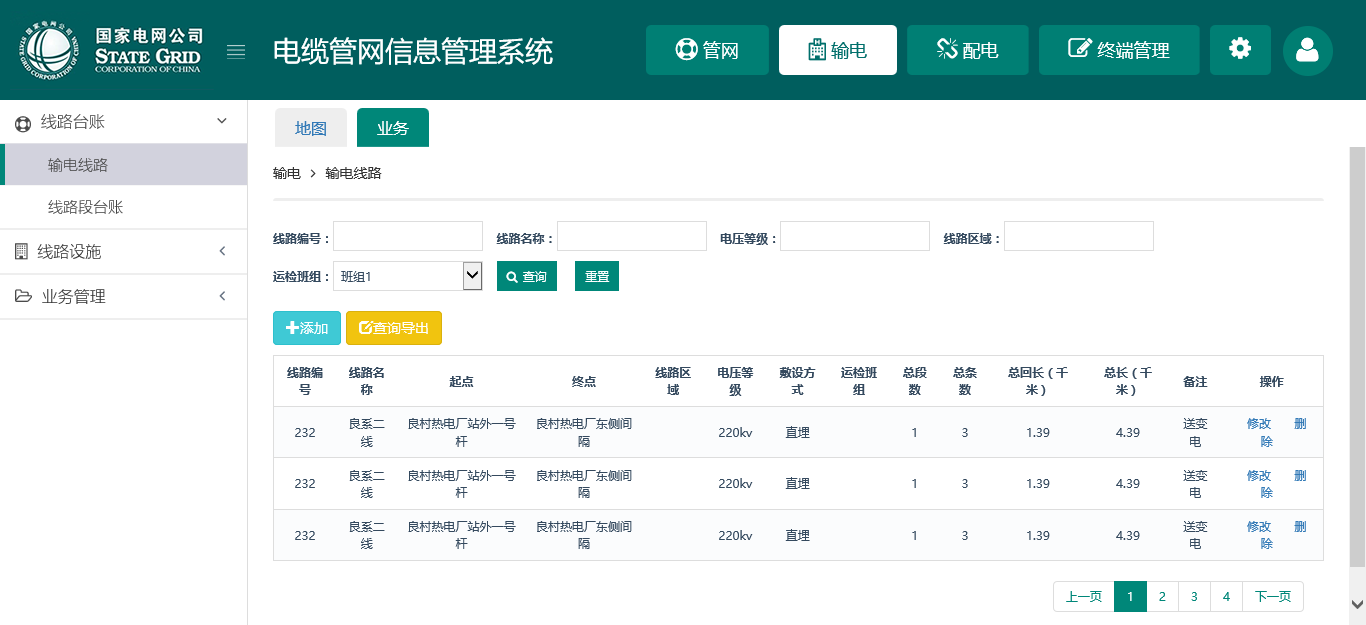 输电:输电线路,输电线路段,输电设施档案,输电本体台账,输电终端台账,输电接头台账,输电接地箱,输电电缆敷设,